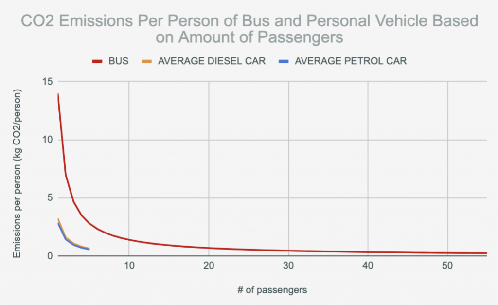 Bus emissions are estimated using a single user input: the distance the user is travelling. We assume all buses use Diesel fuel (2-D), and using the density of diesel 2-D, trip distance, and average kmpl for a Volvo bus (common in Cyprus), the calculator estimates the amount of fuel needed for the trip. The mass of fuel is multiplied by an emissions factor (ratio of CO2 emitted to mass of fuel consumed) to determine the total amount of CO2 emitted. Once this number is calculated, the next question is how many passengers are on the bus. This can be used to calculate the average emissions per person. The emissions-per-person statistic is particularly meaningful when comparing the emissions between taking a bus for the trip or a personal car.